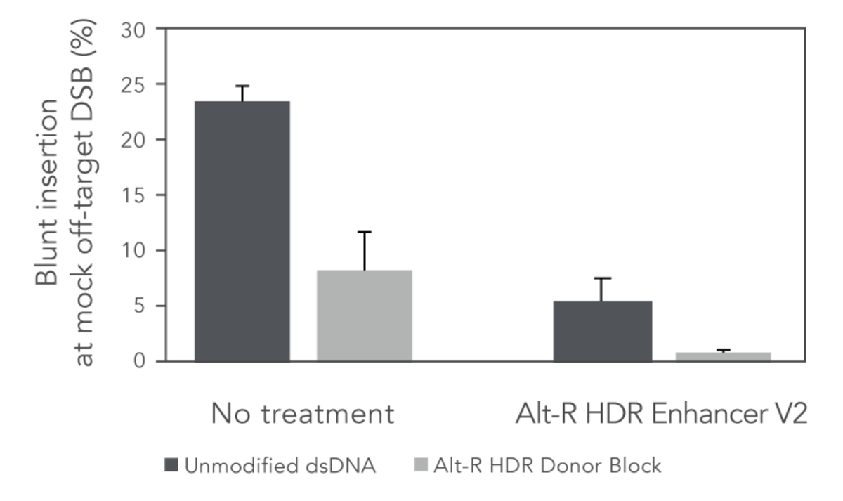 Since use of dsDNA templates may pose a risk for unwanted off-target integrations, the ability of the Alt-R HDR Donor Blocks to reduce the occurrence of this unwanted repair event was examined. As shown in Figure 2, use of Alt-R HDR Donor Blocks reduced the blunt insertions at a mock off-target double strand break by 65% compared to unmodified dsDNA. Addition of Alt-R HDR Enhancer V2 further reduced the off-target integration, lowering blunt insertion levels to 1% (Figure 2).