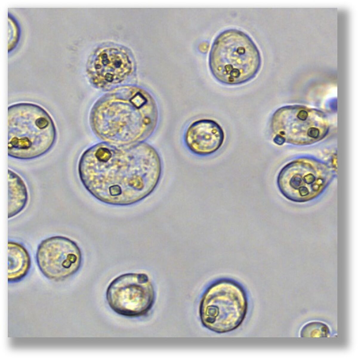 PODS® contain a cargo protein that is encased within a microcrystal formed by self-assembly of polyhedrin protein. The process of generating these crystals all occurs inside the insect expression cell and results in perfect cubic structures about 0.2 - 5 microns across. The PODS polyhedrin crystal shell also protects the active protein during purification, ensuring the cargo protein is not denatured and is therefore correctly folded and functional. Even under the light microscope, you can see the cubic structure of the polyhedrin crystal. Empty PODS crystals are transparent but refract light when loaded with cargo. For most purposes, this does not interfere with imaging.