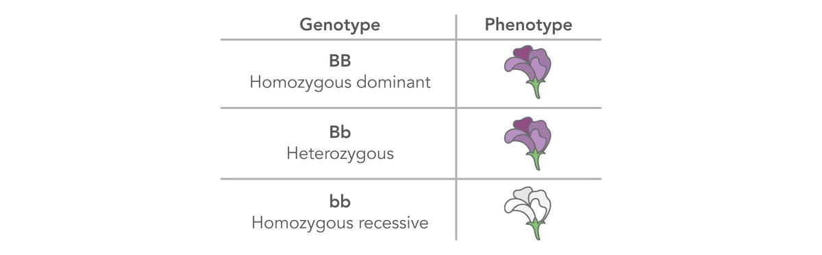 | Heterozygous (Bb) | An individual who has 2 different alleles for the same trait, with one dominant over the other recessive allele. |