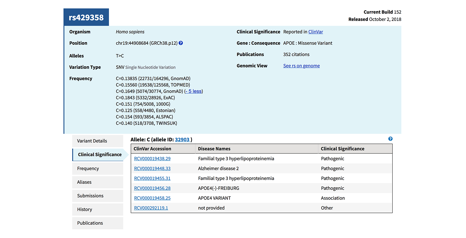 Figure 4. RefSNP entry for a pathogenic SNV. Accessed from www.ncbi.nlm.nih.gov/projects/SNP/snp_ref.cgi?rs=429358 on 20 Feb 2019.