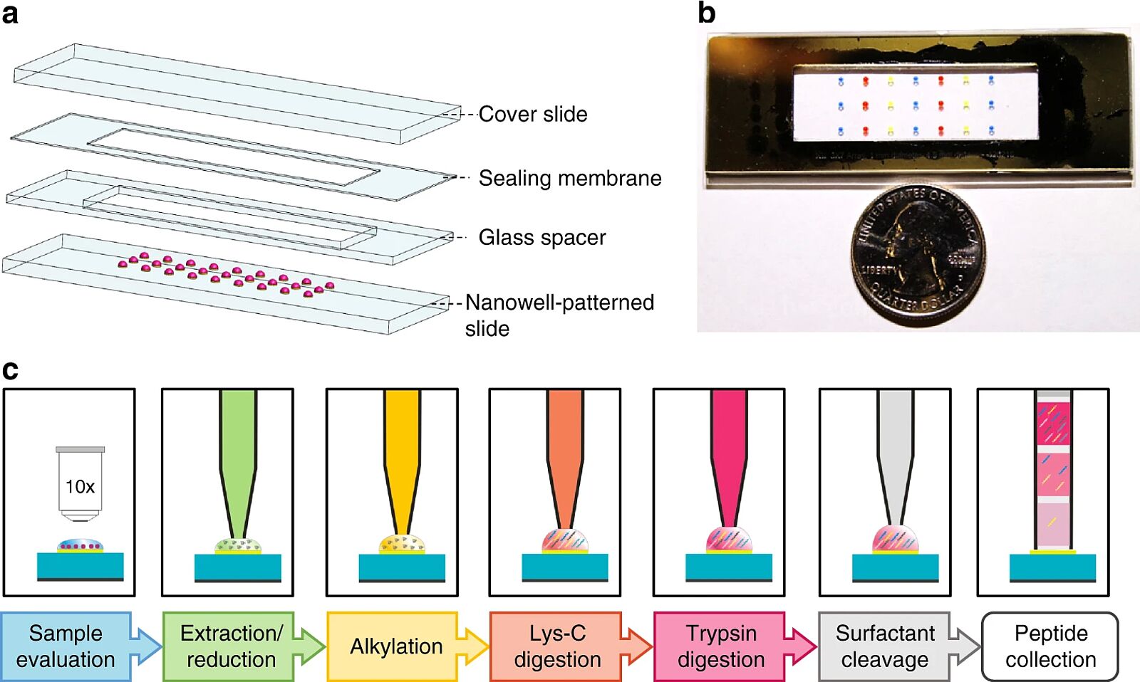 One of the challenges of spatial and single-cell proteomics is sensitivity. Sensitivity is limited by the inherent “sticky” nature of proteins that lead to nonspecific adsorption to reaction vessels. This, in turn, leads to sample losses from the numerous sample preparation steps. The steps include sample lysis, protein extraction, and digestion into peptides. Separation steps follow before mass spectrometric and data analysis. To reduce sample loss in these steps, an approach named nanoPOTS has been developed. NanoPOTS, standing for Nanodroplet Processing in One Pot for Trace Samples, allows the sensitive proteomic analysis of small cell populations. As the name suggests, the NanoPOTS approach performs all reactions from cell lysis to chemical digestion and separation in a single nanodroplet (<200 nL). The spots are robotically dispensed onto a patterned glass slide.