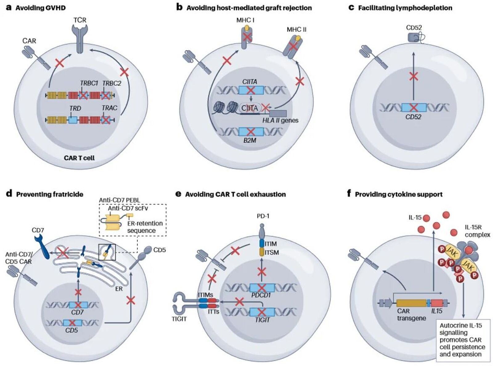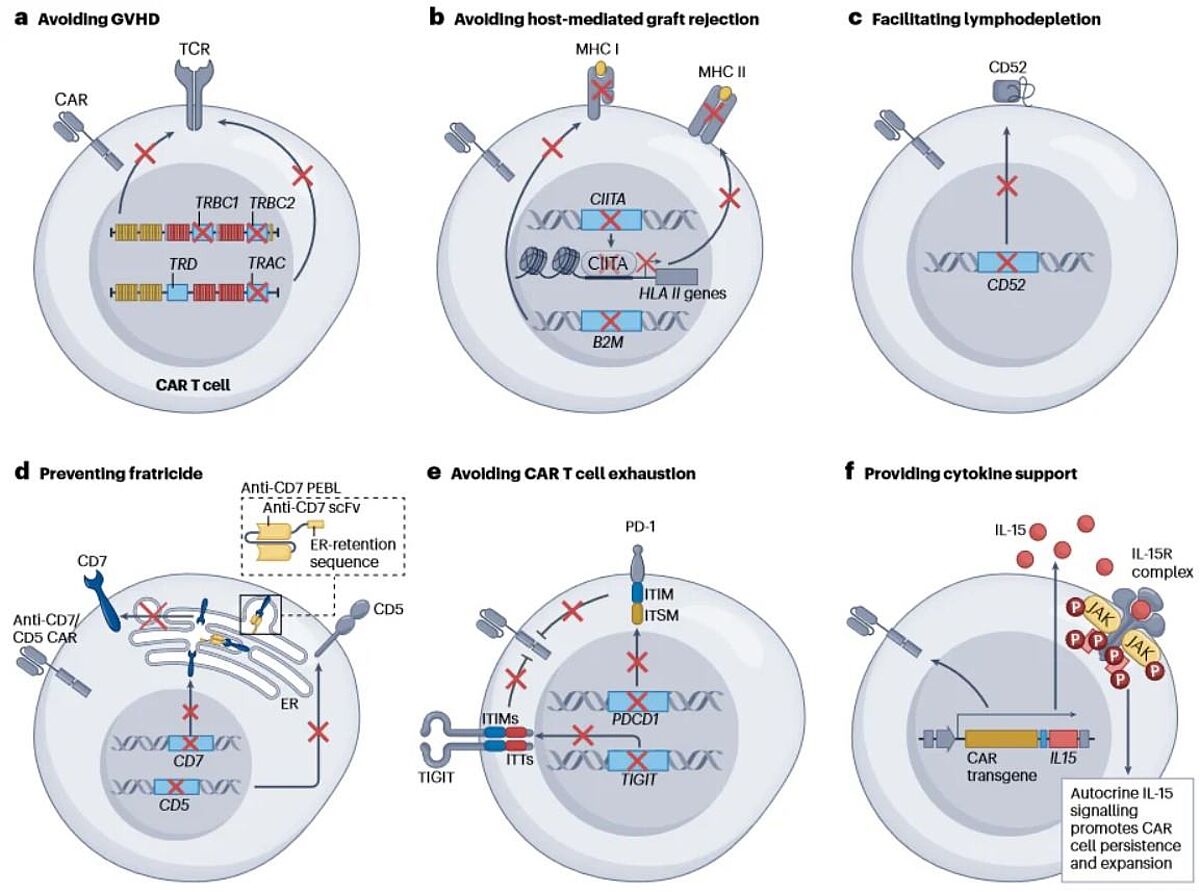 However, allogeneic cell therapy also faces certain limitations. The major risks for allogenic therapy stem from host-mediated graft rejection and graft-versus-host disease (GvHD). The host immune system recognizes donor cells’ MHC molecules and rapidly eliminates the CAR-T cells. This shortens the persistence of CAR-T cells in the patient’s body, leading to reduced efficacy. Moreover, donor CAR-T cells will also attack host tissues, causing symptoms in the skin, liver, and gastrointestinal tract, and potentially leading to multi-organ damage that can be life-threatening. Fortunately, these risks can be effectively minimized through genetic engineering of cell products (Figure 2) or by using other types of immune cells (Table 1). These cell types offer unique immunological features that can reduce the need for extensive gene editing or avoid GvHD at the source.
