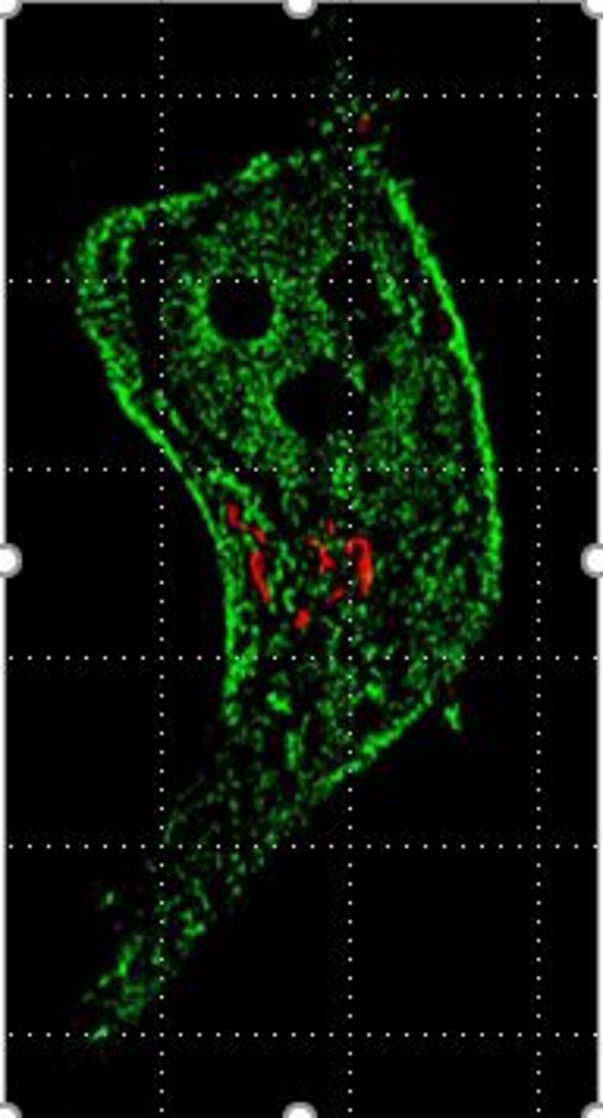In this spooktacular image, we witness the ghostly world of cellular biology come to life! HeLa cells, dressed up as green glowing ghosts (X-GFP protein), are caught mid-scream as they realize their endoplasmic reticulum (ER) has been turned into a haunted house (mCherry-B1-4-Galactosyltransferase staining).