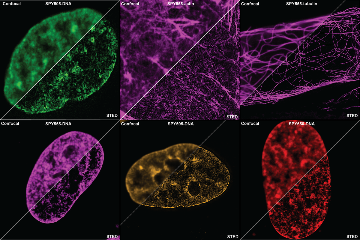 SPY™ probes are live cell, fluorogenic, photostable and STED/SIM compatible. They keep all the nice properties of our SiR-probes but work in different channels such as FITC, TMR or Texas Red. Probes for DNA (nucleus), actin and microtubules are available.
